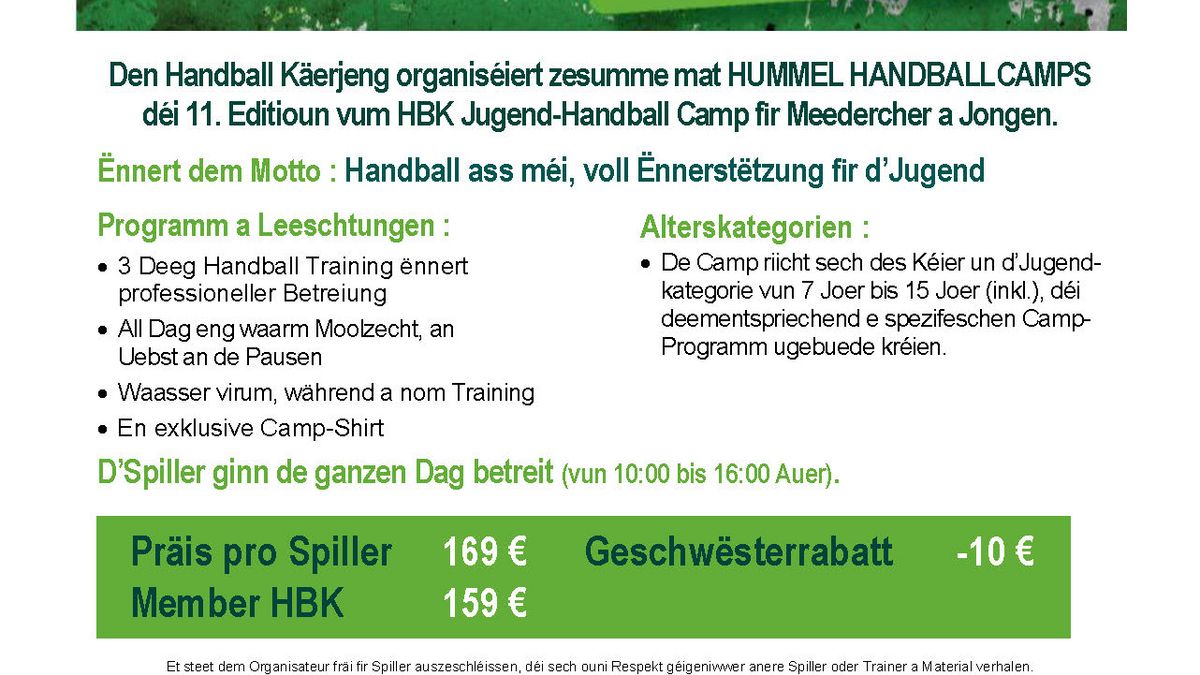 Den Handball Käerjeng invitéiert d'Kanner (Meedercher a Jonge ) vu 7 bis 15 Joer op den 11. HBK Jugend-Handball Camp vum 7. bis 9. Abrëll zu Käerjeng am Dribbel.