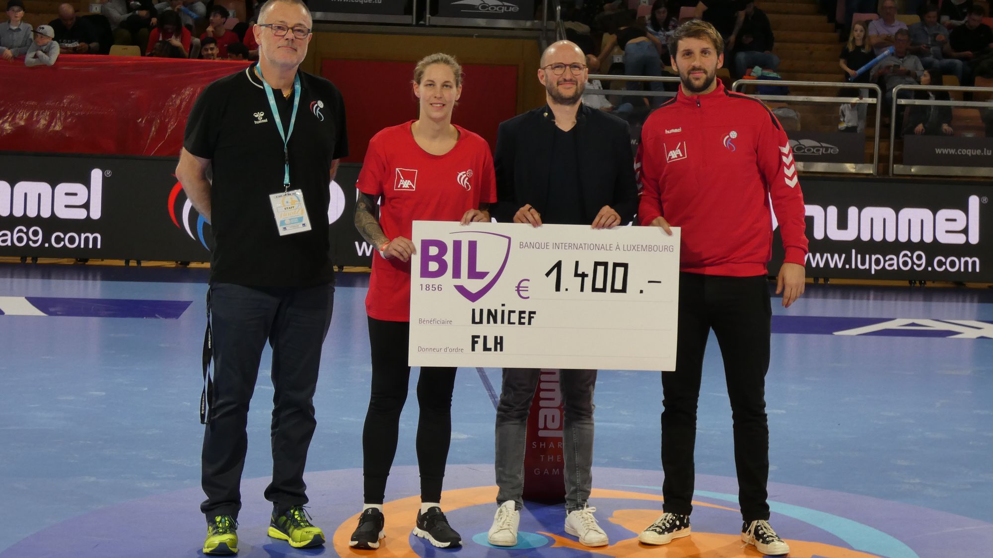 Bei Geleeënheet vun der Finall vun de Männer wärend dem Final4 huet d'FLH (Christian Schmitt Directeur Administratif) zesumme mat de Kapitäne vun der Fraenationalekipp (Tina Welter) an der Männernationalekipp (Tommy Wirtz) e Scheck an héicht vu 1400 Euro un den Här Paul Heber Chief Communication vun UNICEF Luxembourg iwwerreecht.