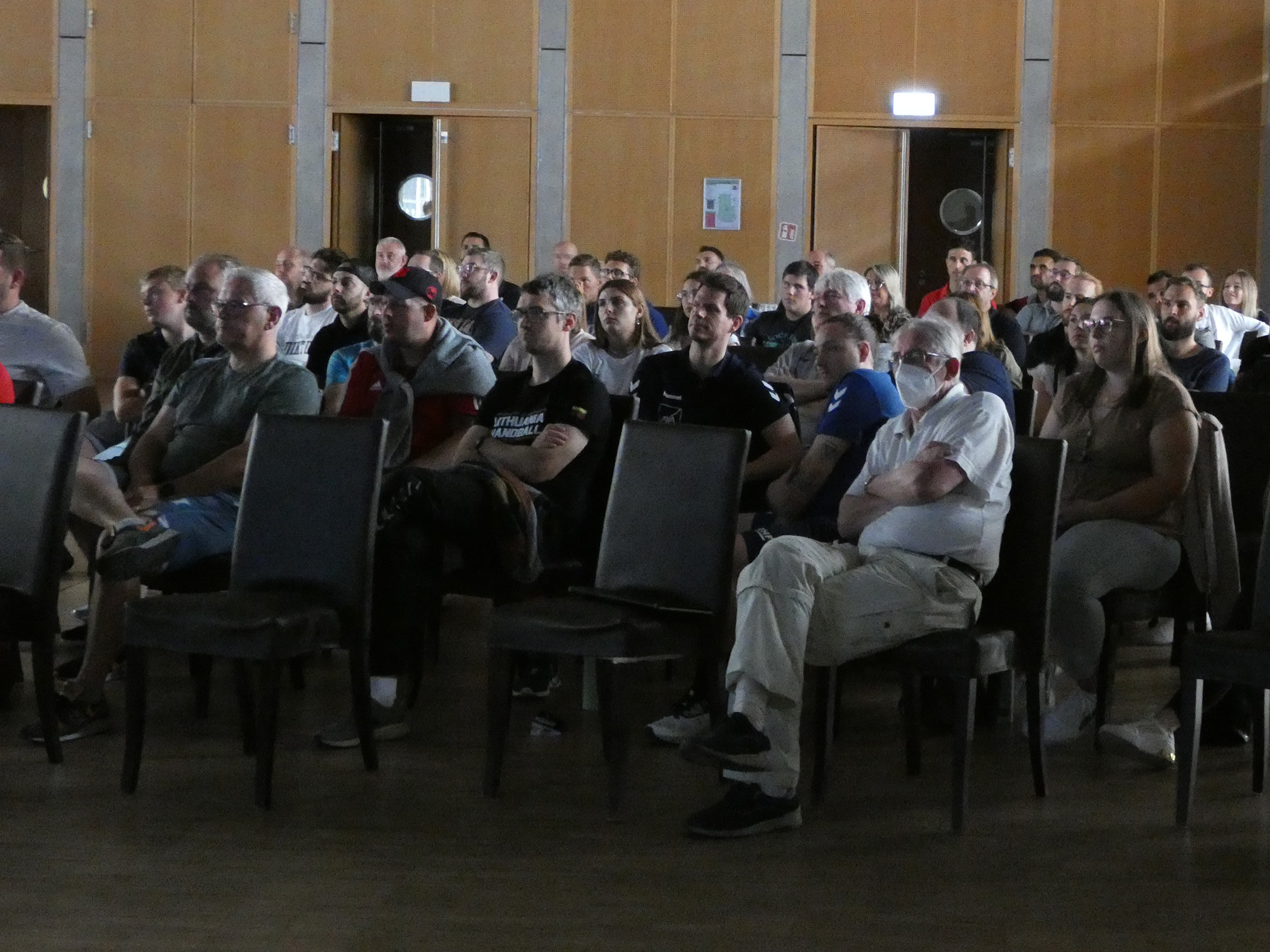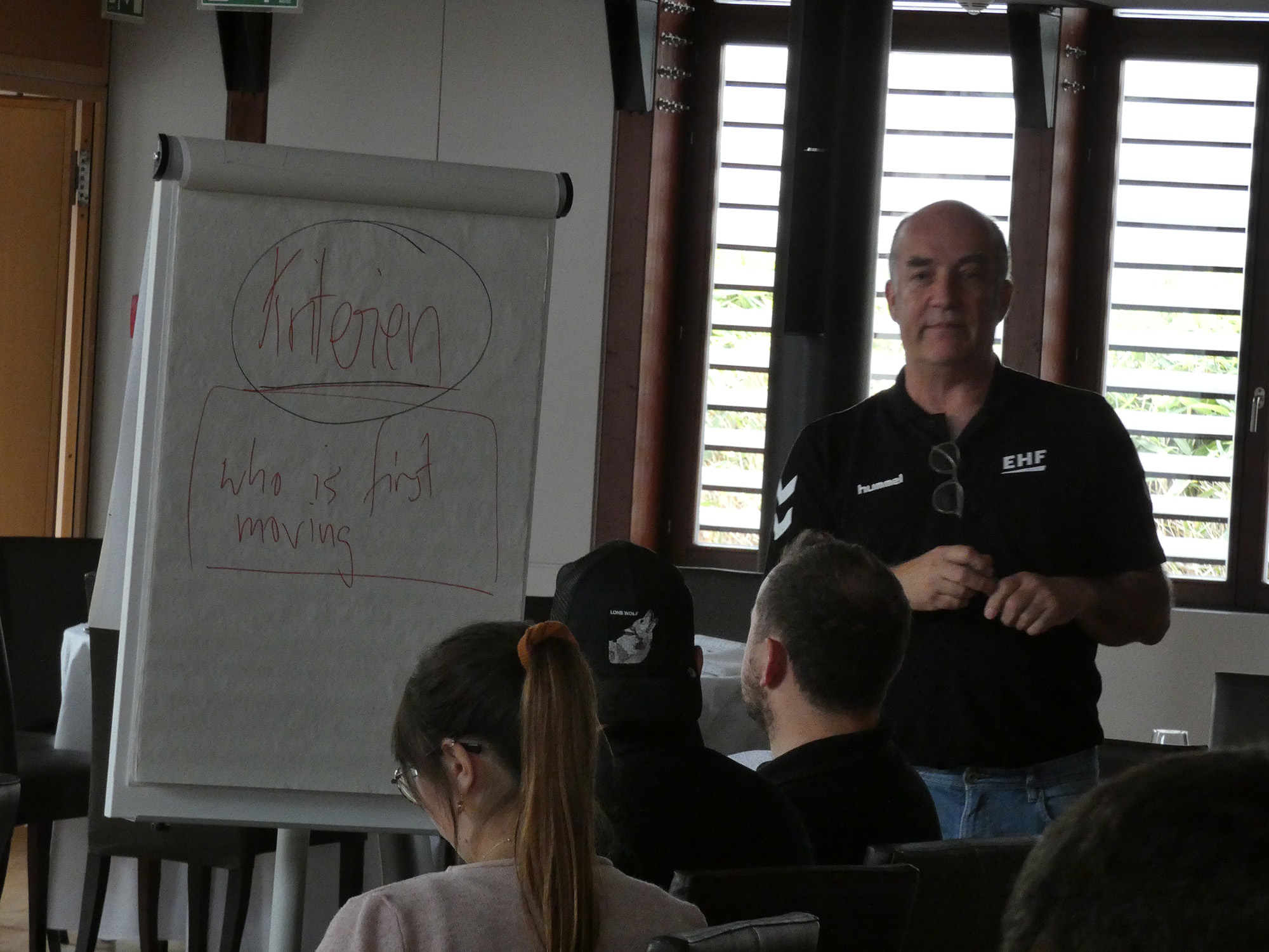 Eise Gaascht, den EHF Delegéierten a Lecturer Beat Nagel aus der Schwäiz, huet virun engem gutt besaatene Sall am Domaine Thermal zu Mondorf, déi nei Reegele mat enger Abberzuel vu Videoclips erkläert.