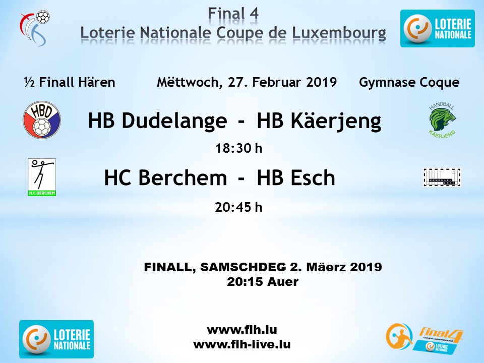 gespillt gëtt Mëttwoch de 27. Februar 2019 am Gymnase an der Coque (18:30 an 20:30 Auer)