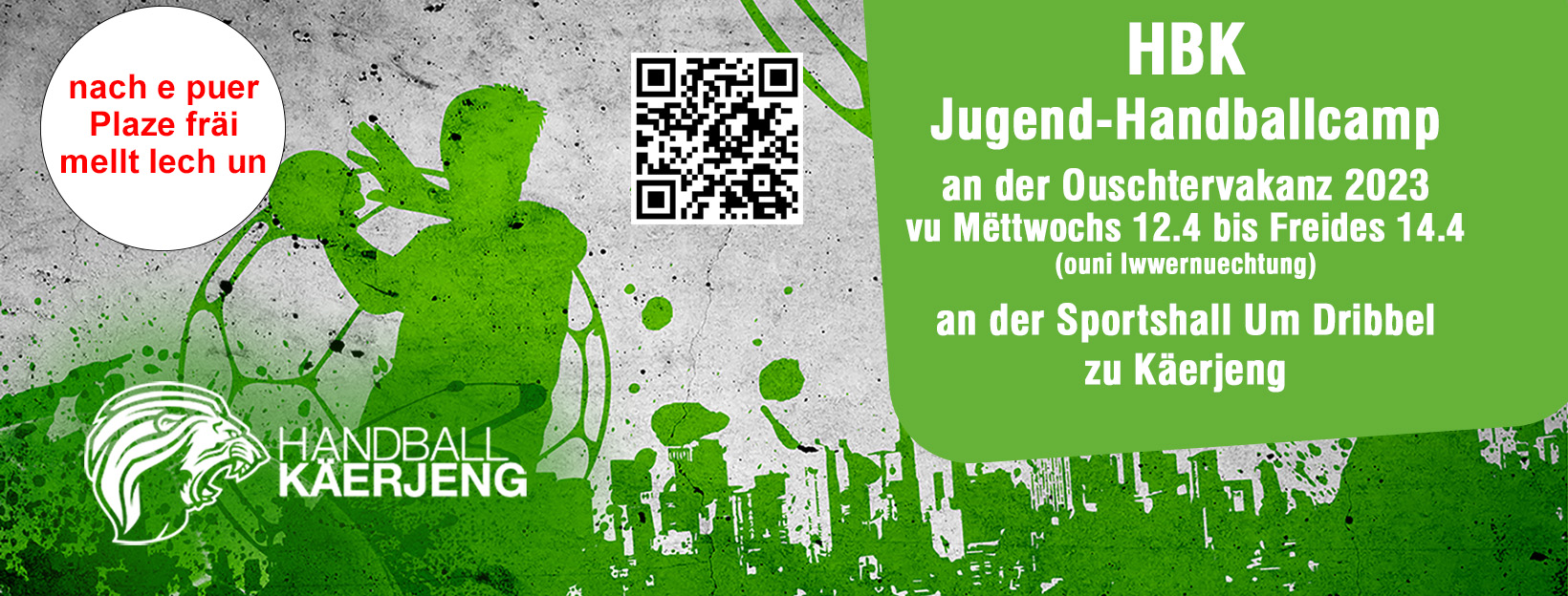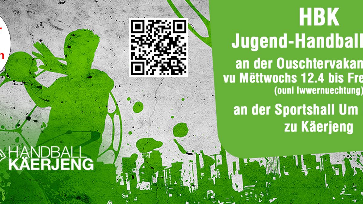 Den Handball Käerjeng organiséiert zesumme mat HUMMEL HANDBALLCAMPS déi 8. Editioun vum HBK Jugend-Handball Camp fir Meedercher a Jongen an der Ouschtervakanz 2023 vu Mëttwoch 12.4. bis Freideg 14.4. (ouni Iwwernuechtung) an der Sportshal « Um Dribbel »