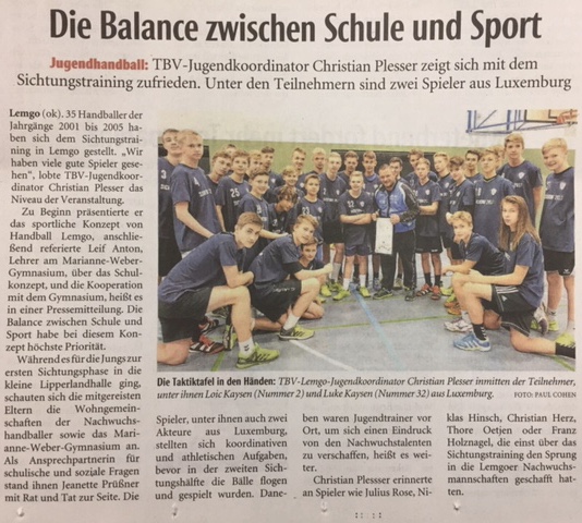 Esou hunn ganz rezent 3 Lëtzebuerger Bouwen, de Loic a Luke vum HC Berchem an de Charel vum HB Käerjeng, un engem "Sichtungslehrgang" vum TBV Lemgo deelgeholl. Nieft dem sportleche Volet gëtt natierlech de schouleschen Aspekt ganz eescht geholl. Ob eis Bouwen de Sprong an eng auslännesch Handballschoul packe wäert sech dann an de nächste Woche weisen.