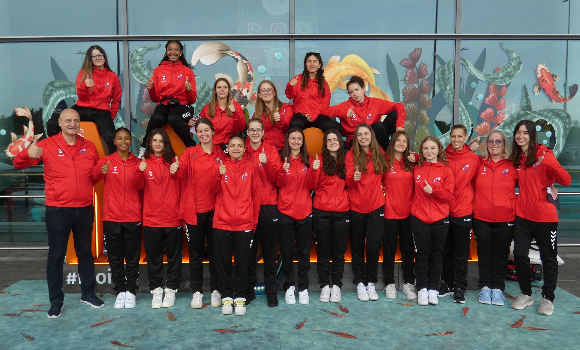Haut de Mueren ass eis U17 Selektioun um 11 Auer vum Findel iwwer Frankfurt op Baku geflunn. Do huelen si un de W17 EHF Championship deel. Hir Géigner sinn Israel (5. August um 11:30 Auer), Spuenien (7.August um 13:45 Auer), Färöer Inselen (9. August um 11:30 Auer) a Griicheland (10. August um 13:45 Auer).
