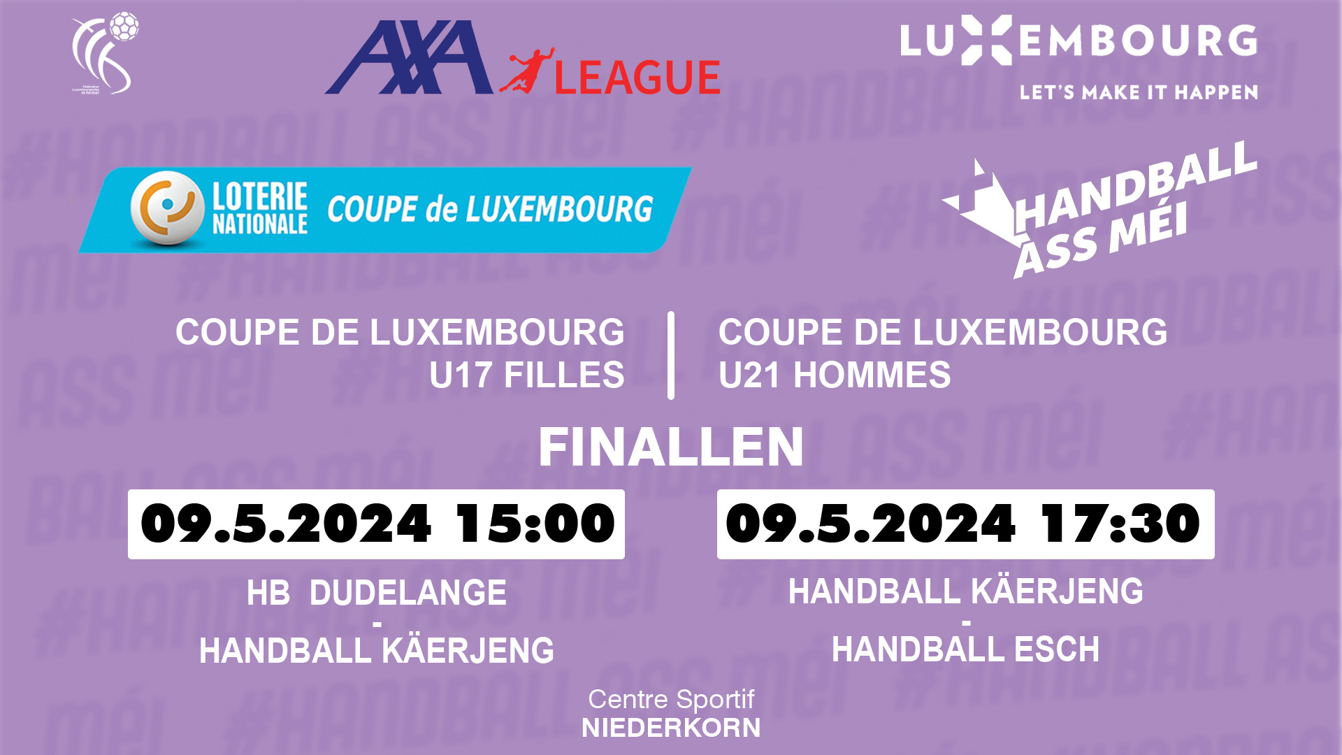 Finalle Coupe de Luxembourg U17 (Meedercher) & U21 (Männer) : Donneschdeg 9. Mee an der Sportshall zu Nidderkuer