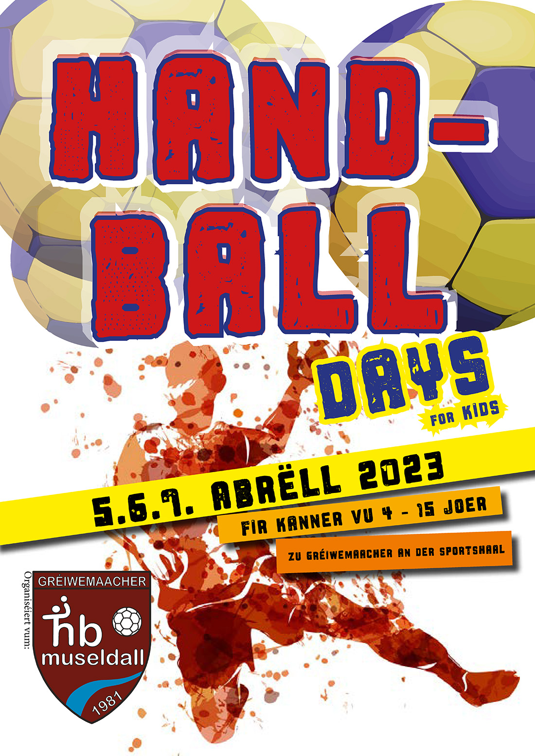 Da komm op d'HANDBALL-DAYS vum HB Museldall, de 5., 6. & 7.Abrëll 2023 zu Gréiwemaacher !