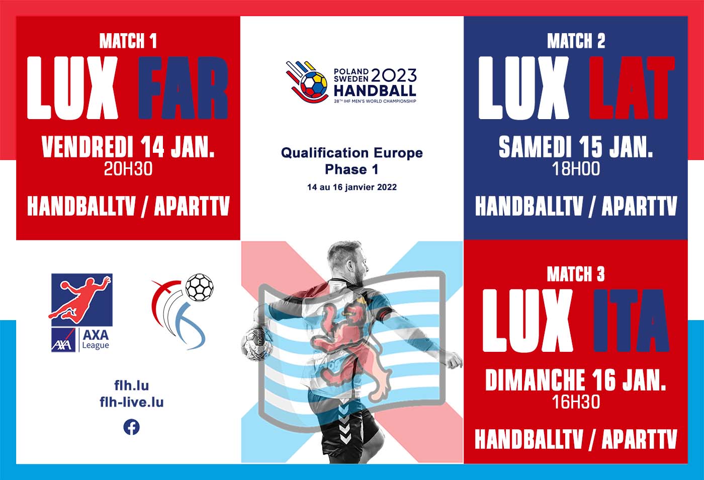 Eis Männer Nationalekipp spillt an der Qualifikatioun fir d'Weltmeeschterschaft 2023 (Euro Phase 1) en Turnéier op de Färöer Inselen vum 14. bis 16. Januar 2022. Si treffen do ausser op d’Färöer Inselen, op Lettland an Italien. De Programm ass folgenden :