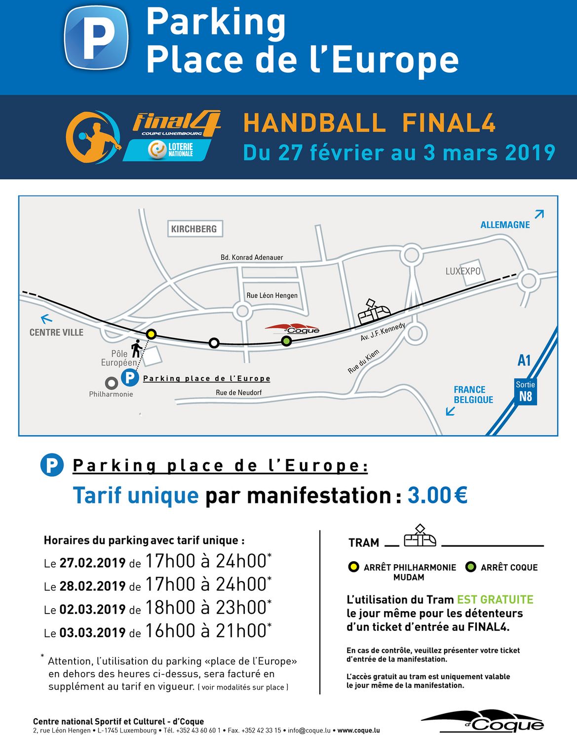 D'FLH mécht drop opmierksam, dass de Parking Place de l'Europe d'Deeg vum Loterie Nationale Final 4 fir 3 Euro zur Verfügung steet. De Parking vun der Coque kascht 3,5 Euro/Stonn. Sportler hunn normal 3 Stonne gratis (den Ticket muss an der Receptioun validéiert ginn). D'FLH iwwerhëlt keng Responsabilitéit. Ëffentlechen Transport ass mam Virverkafsticket gratis. #MirsinnHandball #AXA-League #LoterieNationaleFinal4 #Letsmakeithappen