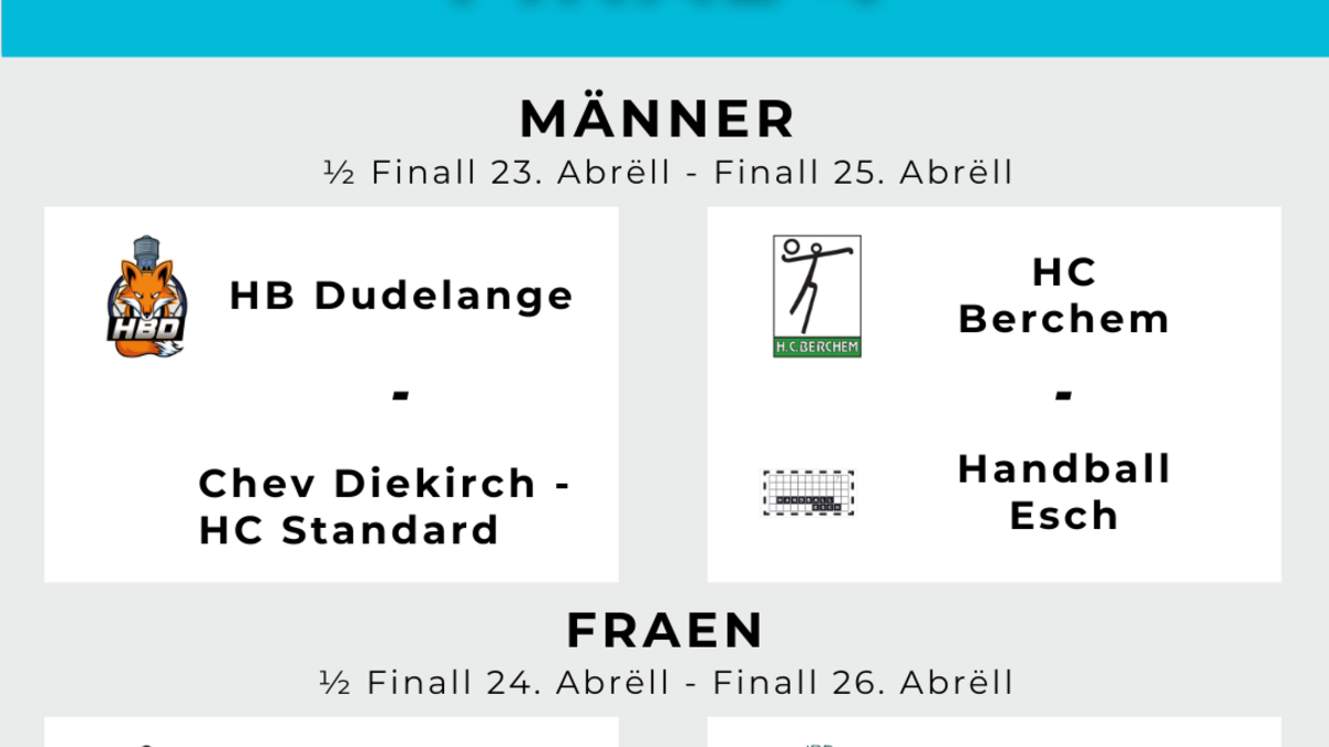 D'Finall bei de Männer ass da Samschdes de 25. Abrëll um 20:15 Auer, an déi vun de Fraen ass Sonndes de 26. Abrëll um 18:00 Auer, all Kéier am Gymnase vun der Coque